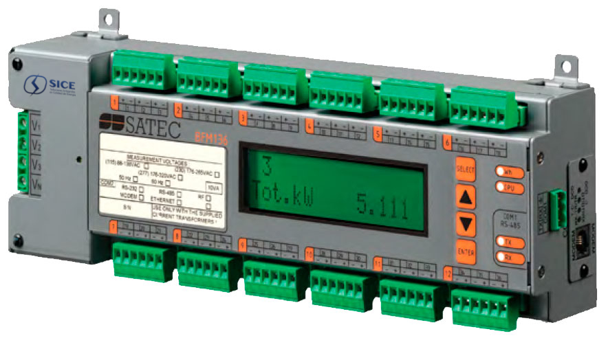 El BFM136 monitorea hasta 12 circuitos trifásicos, 18 de dos circuitos monofásicos o 36 monofásicos, o cualquier combinación de circuitos monofásicos, Circuitos bifásicos o trifásicos.